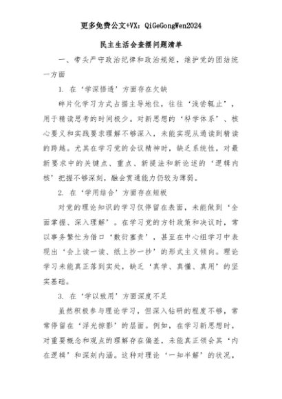 【七哥公文】2025年:民主生活会查摆问题清单+更多免费公文+VX:QiGeGongWen2024+更多免费公文+VX:QiGeGongWen2024