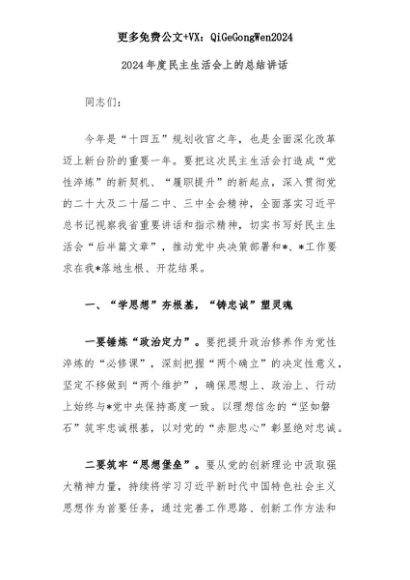 【七哥公文】2025年:2024年度民主生活会上的总结讲话+更多免费公文+VX:QiGeGongWen2024+更多免费公文+VX:QiGeGongWen2024