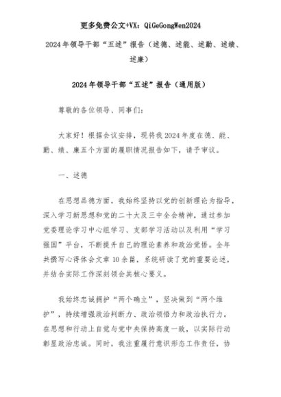 【七哥公文】2025年:2024年领导干部“五述”报告(述德、述能、述勤、述绩、述廉)+更多免费公文+VX:QiGeGongWen2024+更多免费公文+VX:QiGeGongWen2024