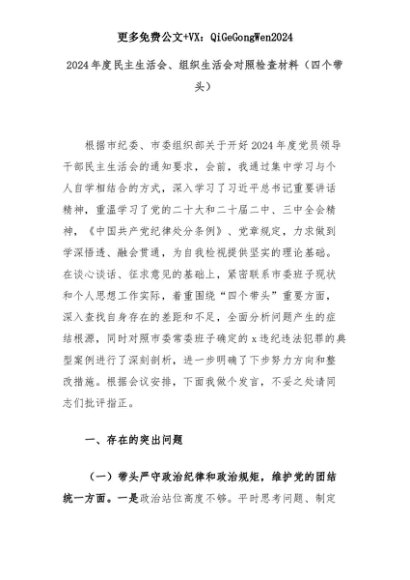 【七哥公文】2025年:2024年度民主生活会、组织生活会对照检查材料(四个带头)+更多免费公文+VX:QiGeGongWen2024+更多免费公文+VX:QiGeGongWen2024