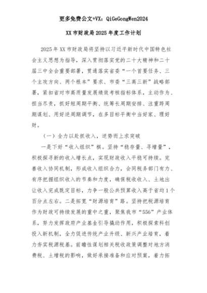 【七哥公文】2025年:XX市财政局2025年度工作计划+更多免费公文+VX:QiGeGongWen2024+更多免费公文+VX:QiGeGongWen2024