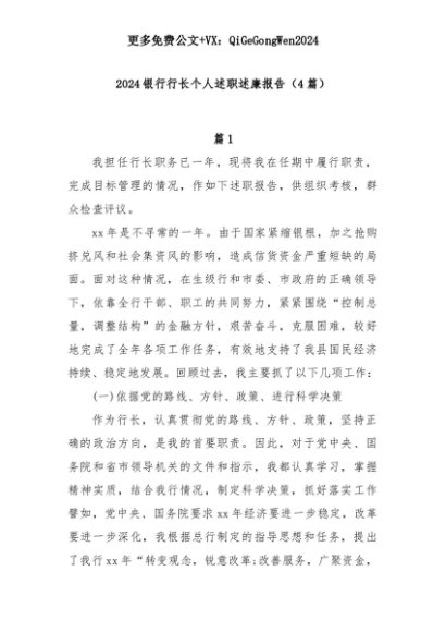 【七哥公文】2025年:(4篇)2024银行行长个人述职述廉报告+更多免费公文+VX:QiGeGongWen2024+更多免费公文+VX:QiGeGongWen2024