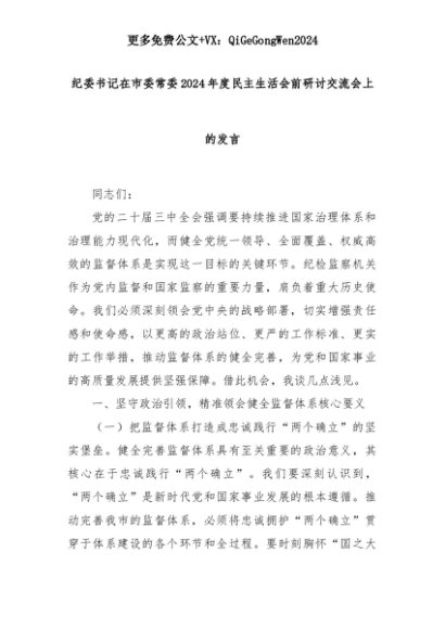 【七哥公文】2025年:纪委书记在市委常委2024年度民主生活会前研讨交流会上的发言+更多免费公文+VX:QiGeGongWen2024+更多免费公文+VX:QiGeGongWen2024