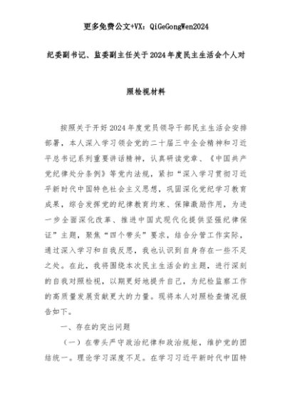 【七哥公文】2025年:纪委副书记、监委副主任关于2024年度民主生活会个人对照检视材料+更多免费公文+VX:QiGeGongWen2024+更多免费公文+VX:QiGeGongWen2024