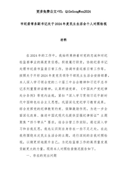 【七哥公文】2025年:市纪委常务副书记关于2024年度民主生活会个人对照检视材料+更多免费公文+VX:QiGeGongWen2024+更多免费公文+VX:QiGeGongWen2024