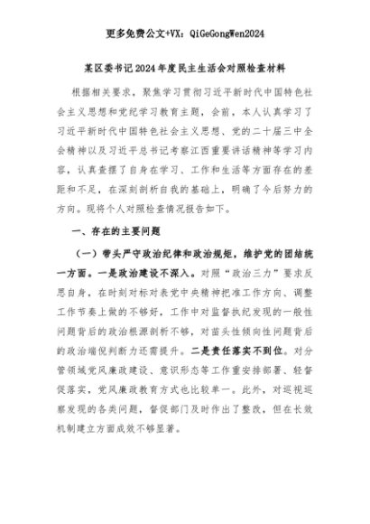 【七哥公文】2025年:某区委书记2024年度民主生活会对照检查材料+更多免费公文+VX:QiGeGongWen2024+更多免费公文+VX:QiGeGongWen2024