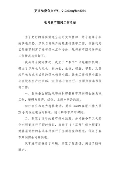 【七哥公文】2025年:电网春节期间工作总结+更多免费公文+VX:QiGeGongWen2024+更多免费公文+VX:QiGeGongWen2024