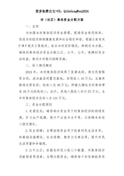 【七哥公文】2025年:村(社区)集体资金分配方案+更多免费公文+VX:QiGeGongWen2024+更多免费公文+VX:QiGeGongWen2024