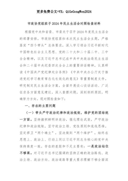 【七哥公文】2025年:市政协党组班子2024年民主生活会对照检查材料+更多免费公文+VX:QiGeGongWen2024+更多免费公文+VX:QiGeGongWen2024