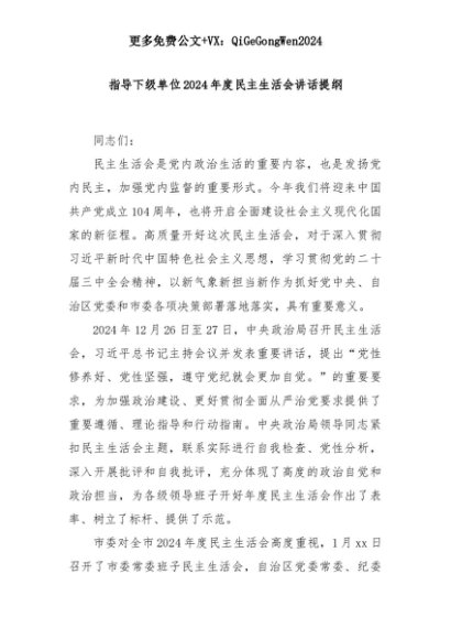【七哥公文】2025年:指导下级单位2024年度民主生活会讲话提纲+更多免费公文+VX:QiGeGongWen2024+更多免费公文+VX:QiGeGongWen2024