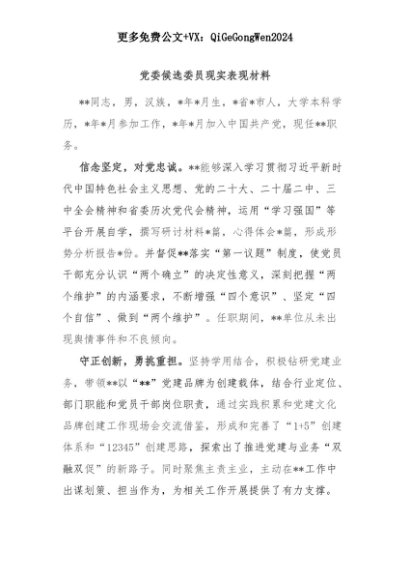【七哥公文】2025年:党委候选委员现实表现材料+更多免费公文+VX:QiGeGongWen2024+更多免费公文+VX:QiGeGongWen2024