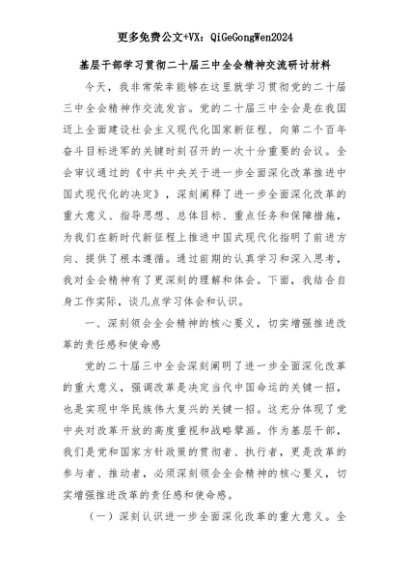 【七哥公文】2025年:基层干部学习贯彻二十届三中全会精神交流研讨材料+更多免费公文+VX:QiGeGongWen2024+更多免费公文+VX:QiGeGongWen2024