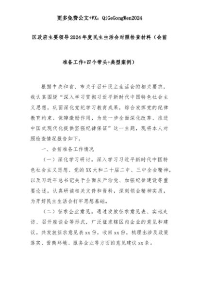 【七哥公文】2025年:区政府主要领导2024年度民主生活会对照检查材料(会前准备工作+四个带头+典型案例)+更多免费公文+VX:QiGeGongWen2024+更多免费公文+VX:QiGeGongWen2024