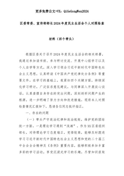 【七哥公文】2025年:区委常委、宣传部部长2024年度民主生活会个人对照检查材料(四个带头)+更多免费公文+VX:QiGeGongWen2024+更多免费公文+VX:QiGeGongWen2024