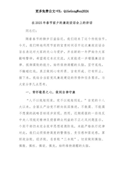 【七哥公文】2025年:在2025年春节前夕的廉政谈话会上的讲话+更多免费公文+VX:QiGeGongWen2024+更多免费公文+VX:QiGeGongWen2024