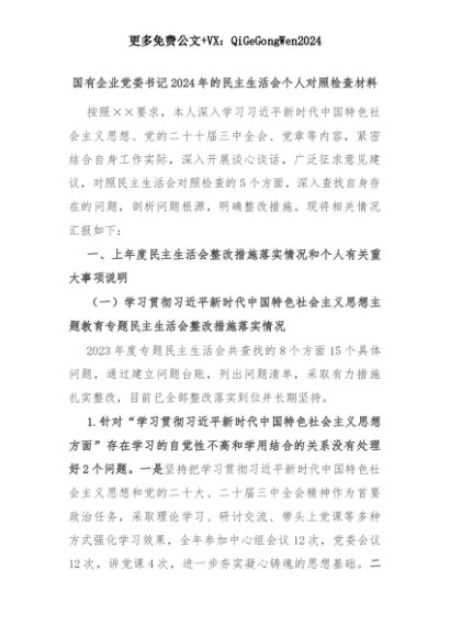 【七哥公文】2025年:国有企业党委书记2024年的民主生活会个人对照检查材料+更多免费公文+VX:QiGeGongWen2024+更多免费公文+VX:QiGeGongWen2024