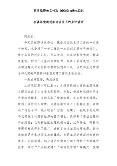 【七哥公文】2025年:在基层党建述职评议会上的点评讲话+更多免费公文+VX:QiGeGongWen2024+更多免费公文+VX:QiGeGongWen2024