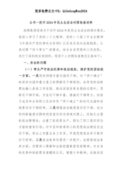 【七哥公文】2025年:公司一把手2024年民主生活会对照检查材料+更多免费公文+VX:QiGeGongWen2024+更多免费公文+VX:QiGeGongWen2024