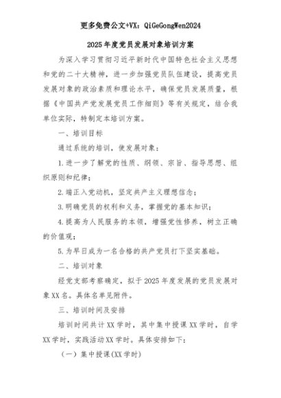 【七哥公文】2025年:2025年度党员发展对象培训方案+更多免费公文+VX:QiGeGongWen2024+更多免费公文+VX:QiGeGongWen2024