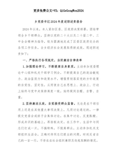 【七哥公文】2025年:乡党委书记2024年度述职述责报告+更多免费公文+VX:QiGeGongWen2024+更多免费公文+VX:QiGeGongWen2024