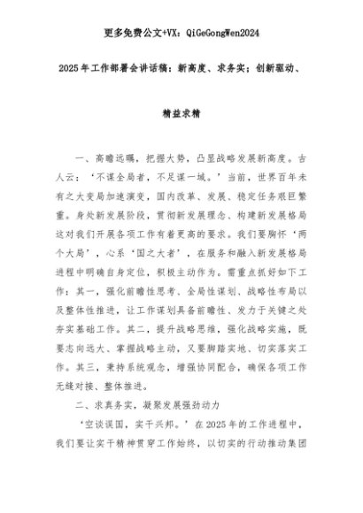 【七哥公文】2025年:2025年工作部署会讲话稿:新高度、求务实;创新驱动、精益求精+更多免费公文+VX:QiGeGongWen2024+更多免费公文+VX:QiGeGongWen2024