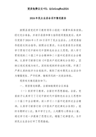 【七哥公文】2025年:2024年民主生活会召开情况报告+更多免费公文+VX:QiGeGongWen2024+更多免费公文+VX:QiGeGongWen2024