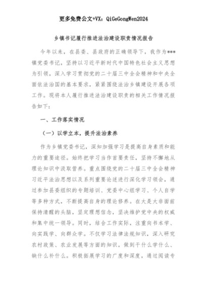 【七哥公文】2025年:乡镇书记履行推进法治建设职责情况报告+更多免费公文+VX:QiGeGongWen2024+更多免费公文+VX:QiGeGongWen2024