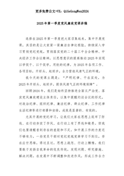 【七哥公文】2025年:2025年第一季度党风廉政党课讲稿+更多免费公文+VX:QiGeGongWen2024+更多免费公文+VX:QiGeGongWen2024