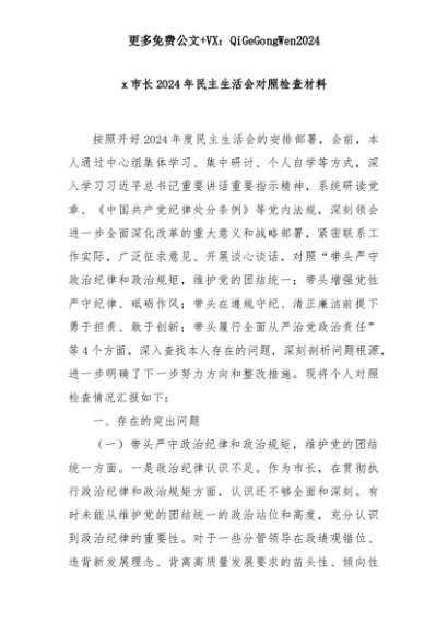 【七哥公文】2025年:x市长2024年民主生活会对照检查材料+更多免费公文+VX:QiGeGongWen2024+更多免费公文+VX:QiGeGongWen2024