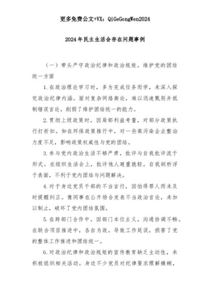 【七哥公文】2025年:2024年民主生活会存在问题事例+更多免费公文+VX:QiGeGongWen2024+更多免费公文+VX:QiGeGongWen2024