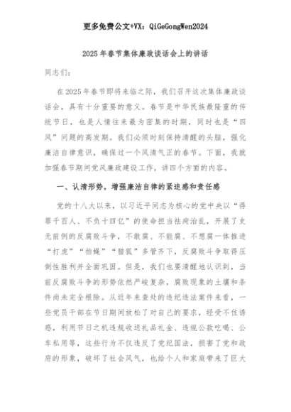 【七哥公文】2025年:2025年春节集体廉政谈话会上的讲话+更多免费公文+VX:QiGeGongWen2024+更多免费公文+VX:QiGeGongWen2024