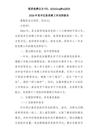 【七哥公文】2025年:2024年党书记抓党建工作述职报告+更多免费公文+VX:QiGeGongWen2024+更多免费公文+VX:QiGeGongWen2024