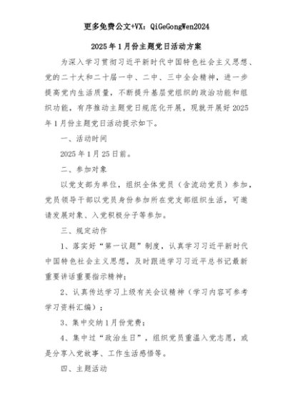 【七哥公文】2025年:2025年1月份主题党日活动方案+更多免费公文+VX:QiGeGongWen2024+更多免费公文+VX:QiGeGongWen2024