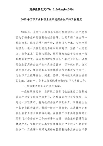 【七哥公文】2025年:2025年X市工业和信息化系统安全生产的工作要点+更多免费公文+VX:QiGeGongWen2024+更多免费公文+VX:QiGeGongWen2024