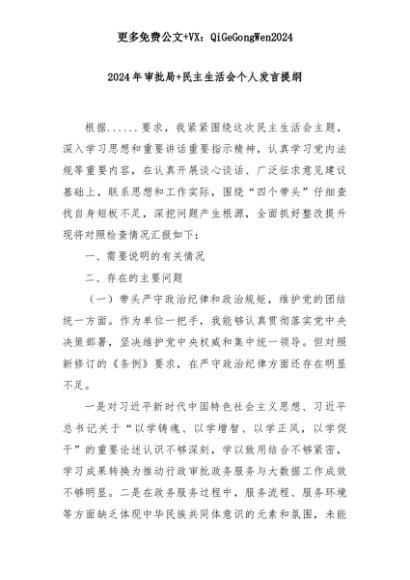 【七哥公文】2025年:2024年审批局+民主生活会个人发言提纲+更多免费公文+VX:QiGeGongWen2024+更多免费公文+VX:QiGeGongWen2024