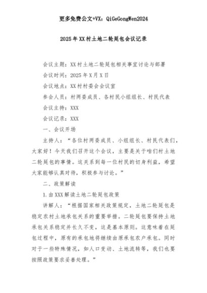 【七哥公文】2025年:2025年XX村土地二轮延包会议记录+更多免费公文+VX:QiGeGongWen2024+更多免费公文+VX:QiGeGongWen2024