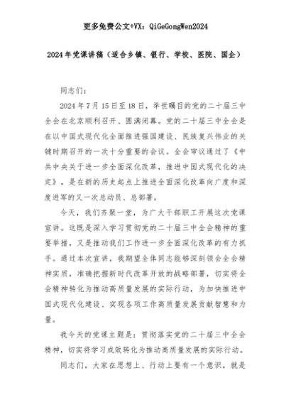 【七哥公文】2025年:2024年党课讲稿(适合乡镇、银行、学校、医院、国企)+更多免费公文+VX:QiGeGongWen2024+更多免费公文+VX:QiGeGongWen2024