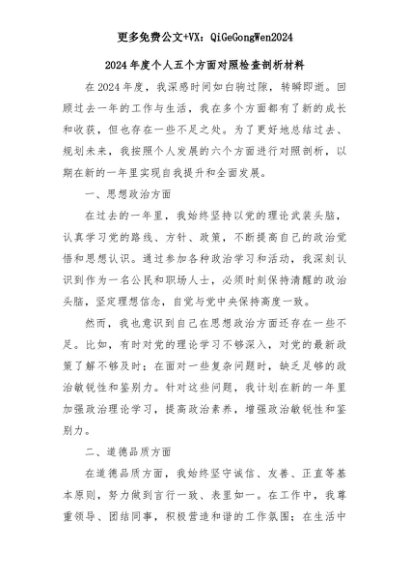 【七哥公文】2025年:2024年度个人五个方面对照检查剖析材料+更多免费公文+VX:QiGeGongWen2024+更多免费公文+VX:QiGeGongWen2024