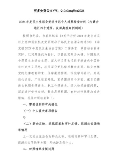【七哥公文】2025年:2024年度民主生活会党组书记个人对照检查材料(内蒙古地区四个对照,反面典型案例剖析)+更多免费公文+VX:QiGeGongWen2024+更多免费公文+VX:QiGeGongWen2024