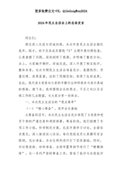 【七哥公文】2025年:2024年民主生活会上的总结发言+更多免费公文+VX:QiGeGongWen2024+更多免费公文+VX:QiGeGongWen2024