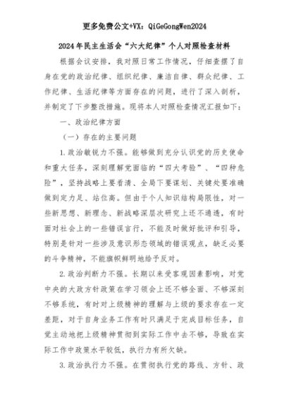 【七哥公文】2025年:2024年民主生活会“六大纪律”个人对照检查材料+更多免费公文+VX:QiGeGongWen2024+更多免费公文+VX:QiGeGongWen2024