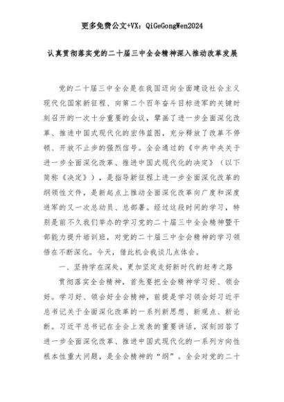 【七哥公文】2025年:认真贯彻落实党的二十届三中全会精神深入推动改革发展+更多免费公文+VX:QiGeGongWen2024+更多免费公文+VX:QiGeGongWen2024