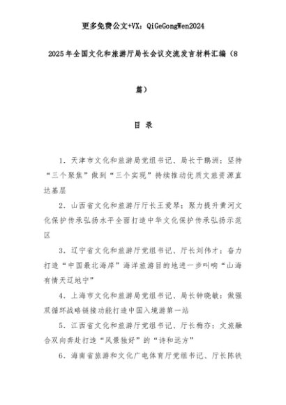 【七哥公文】2025年:(8篇)2025年全国文化和旅游厅局长会议交流发言材料汇编+更多免费公文+VX:QiGeGongWen2024+更多免费公文+VX:QiGeGongWen2024