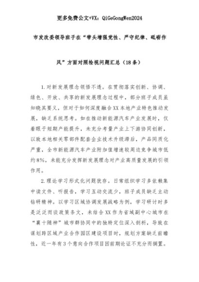【七哥公文】2025年:(18条)市发改委领导班子在“带头增强党性、严守纪律、砥砺作风”方面对照检视问题汇总+更多免费公文+VX:QiGeGongWen2024+更多免费公文+VX:QiGeGongWen2024