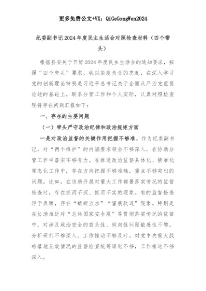 【七哥公文】2025年:纪委副书记2024年度民主生活会对照检查材料(四个带头)+更多免费公文+VX:QiGeGongWen2024+更多免费公文+VX:QiGeGongWen2024