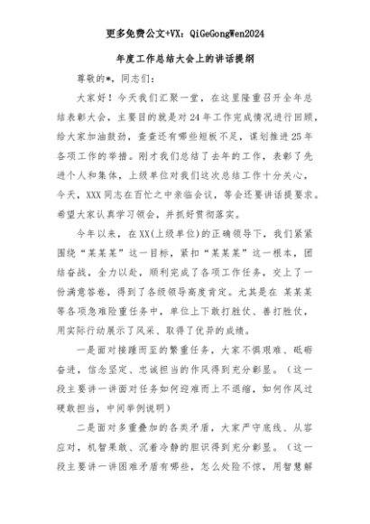 【七哥公文】2025年:年度工作总结大会上的讲话提纲+更多免费公文+VX:QiGeGongWen2024+更多免费公文+VX:QiGeGongWen2024