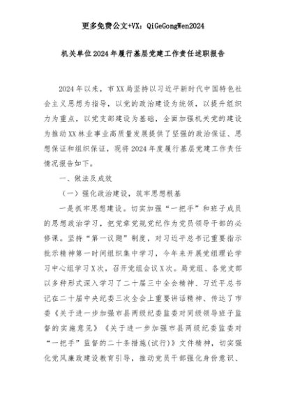 【七哥公文】2025年:机关单位2024年履行基层党建工作责任述职报告+更多免费公文+VX:QiGeGongWen2024+更多免费公文+VX:QiGeGongWen2024