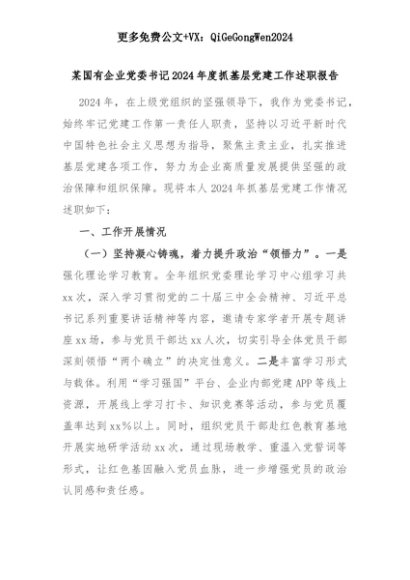 【七哥公文】2025年:某国有企业党委书记2024年度抓基层党建工作述职报告+更多免费公文+VX:QiGeGongWen2024+更多免费公文+VX:QiGeGongWen2024