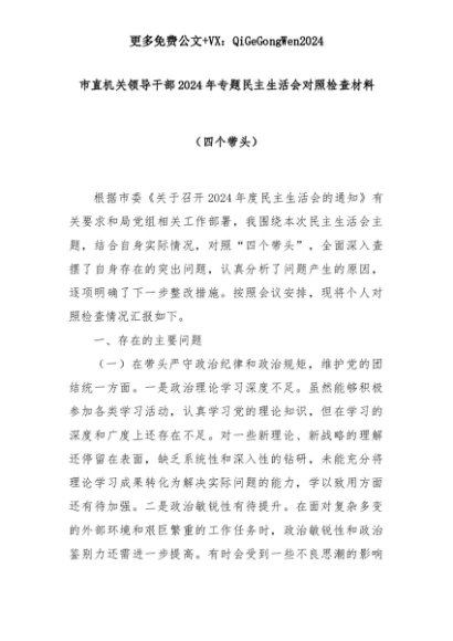 【七哥公文】2025年:市直机关领导干部2024年专题民主生活会对照检查材料(四个带头)+更多免费公文+VX:QiGeGongWen2024+更多免费公文+VX:QiGeGongWen2024