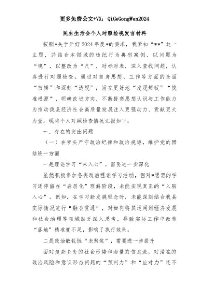 【七哥公文】2025年:民主生活会个人对照检视发言材料+更多免费公文+VX:QiGeGongWen2024+更多免费公文+VX:QiGeGongWen2024